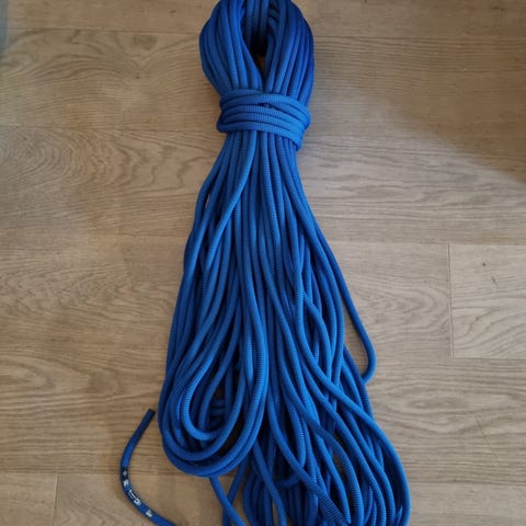 Säljer ett kraftigt klätterrep i naturfiber med metallbeslag för upphängning och plastad ände för bättre grepp.