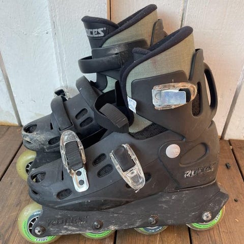 Storlek 39, hjuldiameter 76 mm, justerbar broms på höger, pjäx låsning som gör att dom sitter stabilt på fötterna. Hjälm (storlek 58-62, vikt 360 g) medföljer likaså handledsskydd.