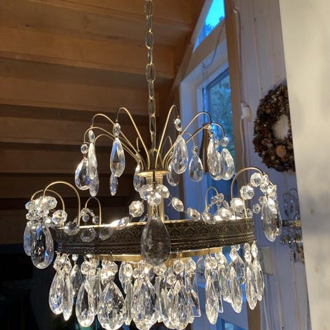 Mässingstomme och äkta kristallprismor, diameter 45 cm, höjd med kedja 75 cm. Fem E14 lamphållare, glödlampor ingår inte. Rengjord och klar för upphängning.