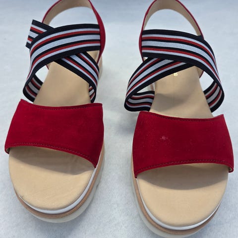 Espadrillos i rött/vitt/svart med guldfärgad detalj. Bekväma, sparsamt använda, mycket fint skick! Nypris ca 1200kr.