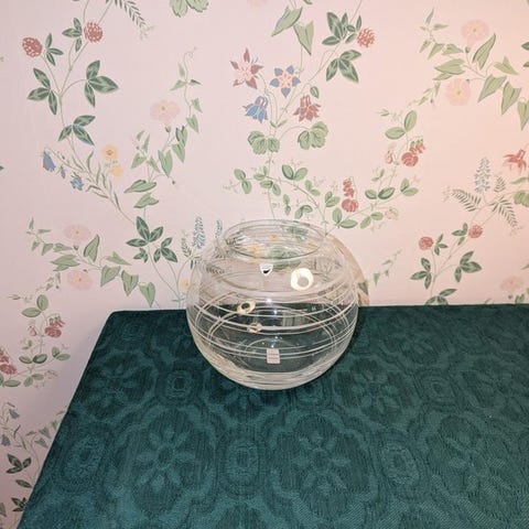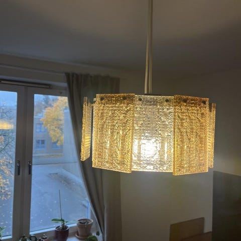 Taklampa med "bubblor" i rökfärgat glas. Skiftar i bärnstens nyans i solljus. Glaskupan är felfri. En äldre, kanske originalupphängningen i trä medföljer. Inköpt hos antikaffär i glasriket.
