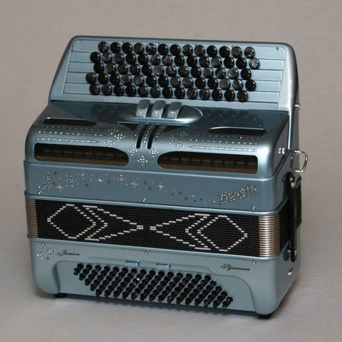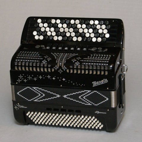 Spelet är i tufft svart utförande med knappar i elfenbenslook i både bas & diskant, har finaste handgjorda bandstålsstämmor och är oktavstämt (16+8) med ett specialanpassat tonomfång: 40/94 (G-Bb).