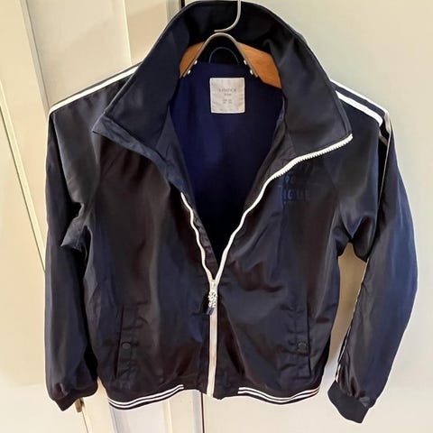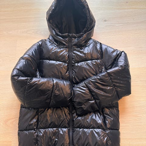 Vit vadderad jacka med svarta prickar och huva. Jackan har en söt design med en markerad midja och knappar framtill