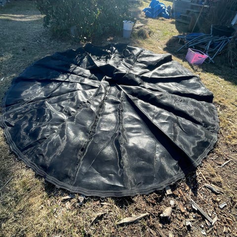 En äldre studsmatta skänkes. Knäppningen till skyddsnätet är dåligt, annars i okej skick.