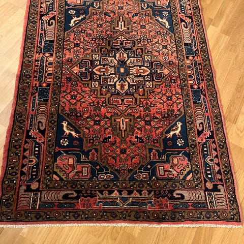 Mattan kan användas på båda sidorna, dvs även användas på baksidan. Jättefin. Storlek med fransarna ca 88 x 300 cm. Hämtas i Kista, säljes pga flytt.
