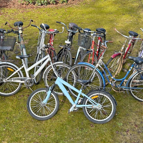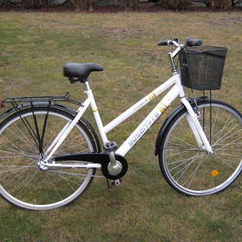 Cykeln är välanvänd men fungerar om däcket åtgärdas. Kedjan behöver nog bytas också och belysningen fungerar ej. Cykelkorgen har någon spricka. Originallås och en nyckel finns.