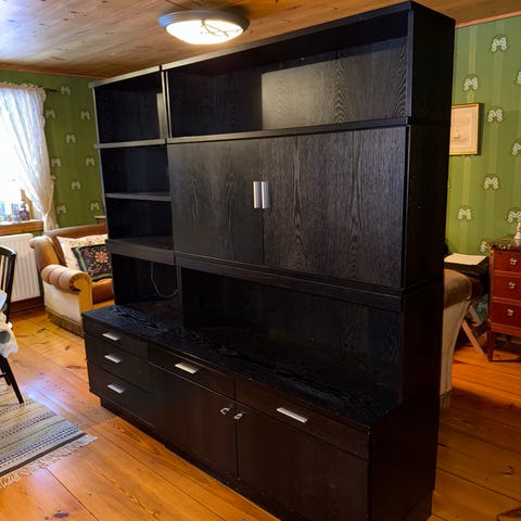 Fina hyllor i vitt med mörka trädetaljer framtill, glashylla längst upp samt belysning i båda. ( lite repor på ett av hyllplanen samt några små repor på träramarna )