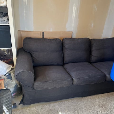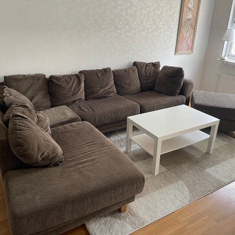 En bekväm och rymlig soffa. Skicket är bra och då man kan ta av tyget så är den lätt att hålla ren! Fyra soffben som är lätta att ta av och på för ex. frakt. Går att montera av armstöden lätt också för frakt.