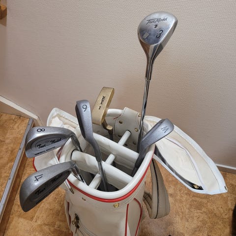 Ett gammalt golfset från JB Halley i London med tillhörande bag. Klubborna har stålskaft men ser ut som hickory, det en 12:a, 4:a, 2:a och en brassie (trä 2).