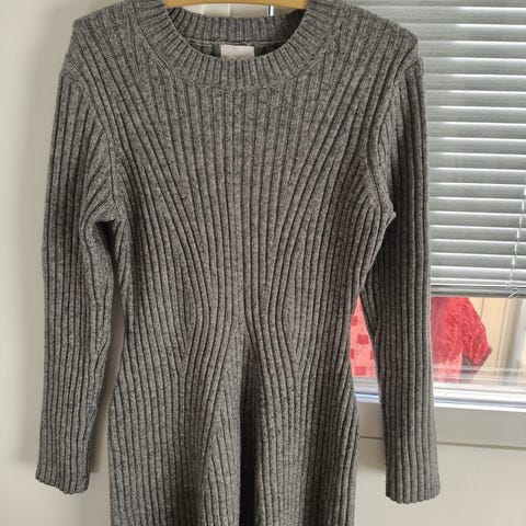 Detta är en stickad tröja i brunt och vitt med guldiga detaljer.