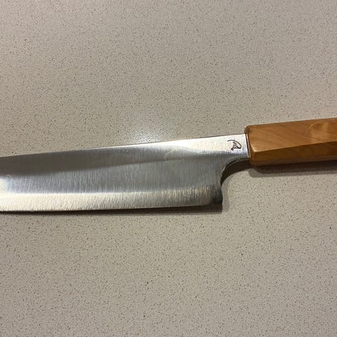 Japanskt stål (0,7% kol + molybden/vanadin), hårdhet 57–58 HRC.