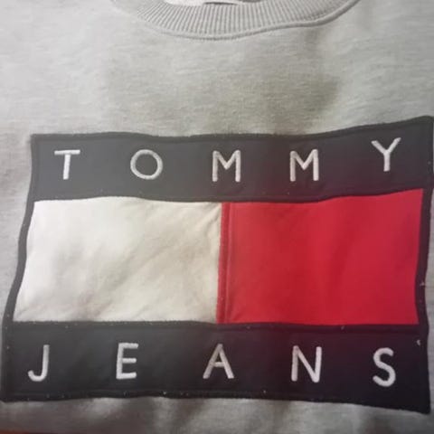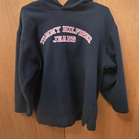 Mjuk hoodie från Tommy Hilfiger med rött sammetsband i luvan. Ficka på magen. Stor hoodie som passar lika bra för tjejer som killar. Längd från axel 68 cm. Bredd över bröst 58 cm. Kan hämtas på Fridhemsgatan vid Fridhemsplan.