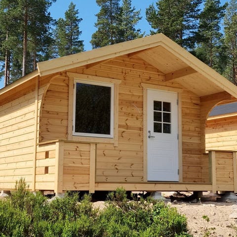Ny byggd friggebod från Bygg och anläggnings programmet. 2700 x 4800 mått på själva bjälklaget. Utvändigt mått 4,9 m ca längd, bredd 2,85 på huskroppen. Bredd med takfot 3,8 m ca. Bjälklaget består av en isolerad trossbotten 45x195 med spån golv. Ytterväggarna är isolerade 45x120 reglar med luftspalt och Dubbelfaspanel. Yttertaket består av isolerade 45x145 takstolar. Ovanpå takstolarna är det en luftspalt, råspont, underlagspapp och 3gradig ytpapp. Ytterdörren är varm isolerad 8x20. Fönstret som är en meter från ytter dörren är ett tvåglas fönster med storleken 11x11. Gavelfönstret är av storleken 12x6. Innertaket består av gipsskivor. Innerväggar består av OSB och gipsskivor. Takhöjden inne är 2450 på den högra delen och 2050 på den lägre delen. Panelen på friggeboden är grundmålad. Vikt ca 2500 kg. Det går bra att få friggeboden målad ute och inne två strykningar mot färg kostnad. Kunden står för frakten själv. Följe bil krävs vid frakt. Friggebodarna är färdiga för leverans i slutet på april/början på maj.