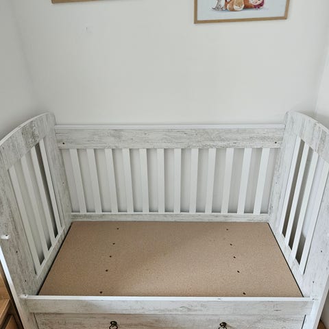 Fint men använt skick, behöver en tvätt och lite skav finns. Alla delar finns så går såklart att göra om till en spjälsäng men idag är den som på bilden. Stödbräda ”ikea nattapa”199kr ingår i priset om man vill ha den.