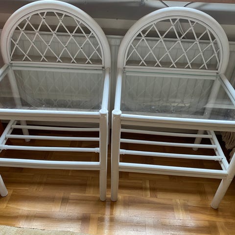 Stilrena och minimalt använda nattduksbord i härdat glas med marmor look som säljes i paketpris.