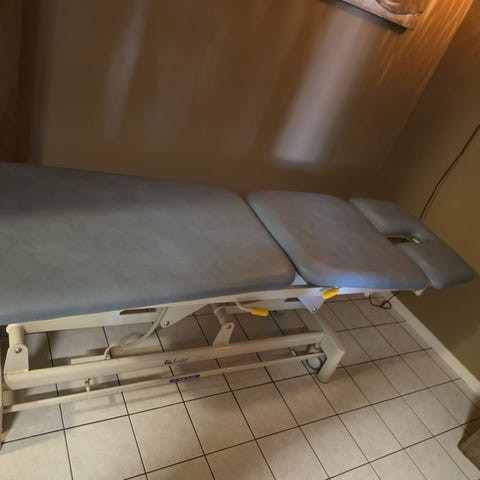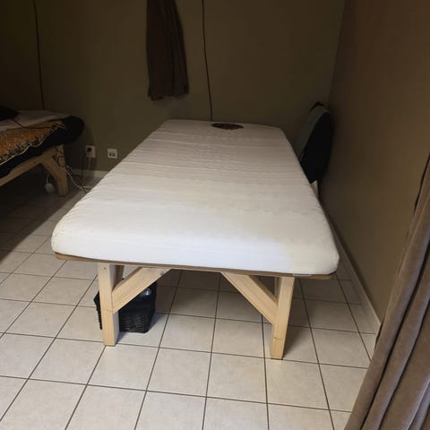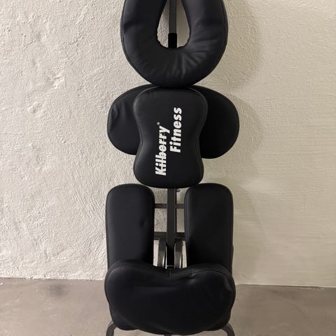 Ergonomisk Massagestol i trä med stoppning. Stolen är justerbar i höjd och har flera olika lägen. Perfekt för att ge en avkopplande massage. Inget slitage, användes för eget, privat bruk. Stolen har ett skyddande fodral med hjul för lätt transport.