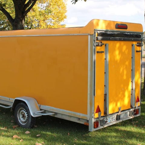 Anmärkning: Handbromsen åker upp i bromsat läge vid enklare test när släpet rullas och har tillfälligt spänts fast/behöver översyn - se bilder.