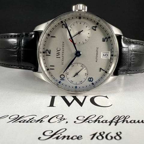 Klockan har integrerat läderband i svart krokodilskinn, bygellås i borstat stål med polerad fasning. Eftersom klockan är sparsamt använd är även läderbandet i mycket gott skick, men med en minimal spricka på baksidan precis vid sista hålet. En fantastisk herrklocka med inhouse-verk från välrenommerade Schweiziska lyxmärket IWC Schaffhausen, i perfekt skick - nära nyskick!