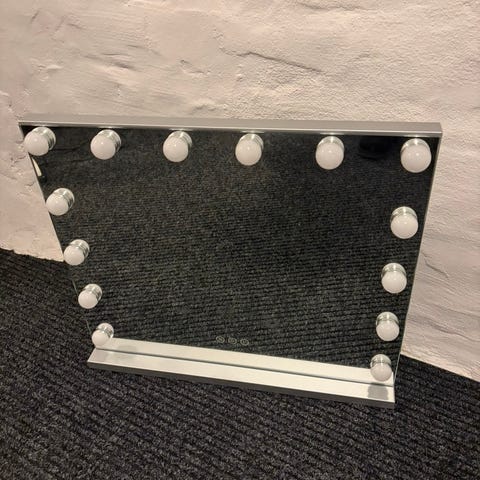 Sminkspegel Mira från Mio. Storlek 50x70 cm. Spegeln är i lackerad metall med plats för 12 ljuskällor.