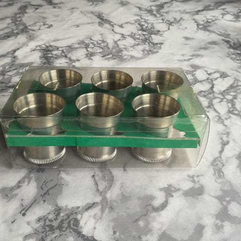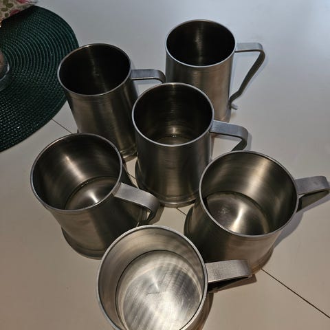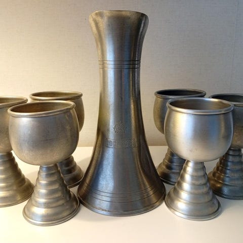 Brännvinsflaska 18 cm och 6 st. snapsmuggar i bra skick.