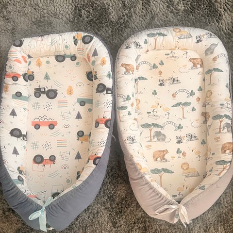 Babylove babynest i rosa färg. Mjukt vadderade kanter runtom och plan liggyta i mitten. Passar för spädbarn som viloplats i säng, soffa eller barnvagnsinsats. Ytterkant har rynkade detaljer längs sidorna. Babynestet är rektangulärt med rundad huvudända och öppningsbar fotända med band/snörning för att justera öppningen. Materialet är textil (tyg) med stoppning i kanterna för att ge stöd runt barnet.