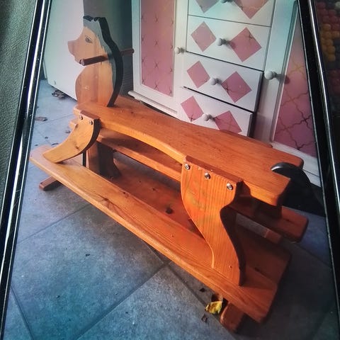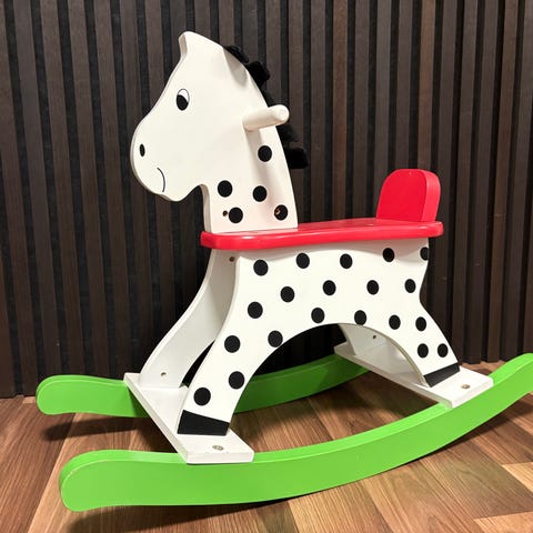 Gunghäst i trä med vit kropp och svarta prickar. Sits i rött och med gröna medar. Utrustad med handtag framtill för barnet att hålla i. Passar som leksak för mindre barn inomhus eller utomhus på jämnt underlag.