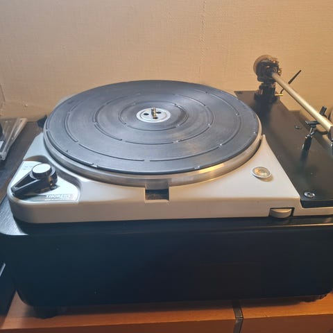 Fin skivspelare Thorens TD 2001 med plint i svart träfanér.