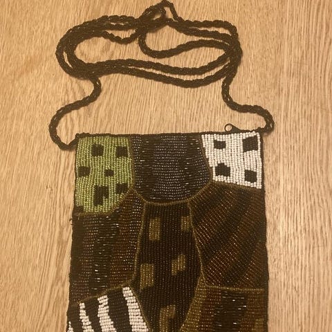 Handväska inköpt i Dubai. En rad med pärlor är trasig. Pärlorna finns kvar och kan sys fast.
