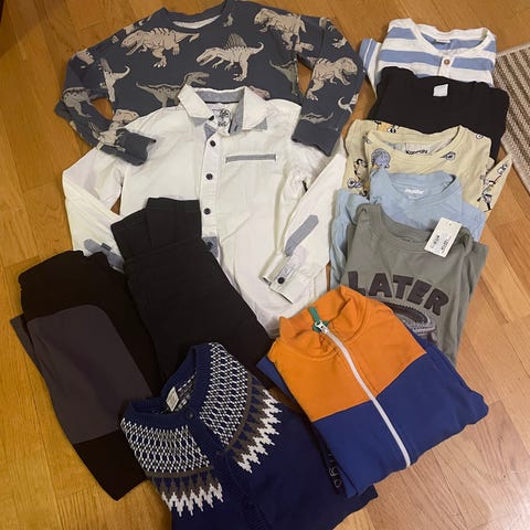 Långärmad tröja med texten "Big sis", 5 klänningar, 1 par byxor, 1 långärmad glittrig tröja.