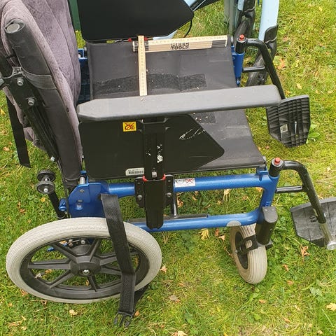 En rullstol Etac M 100 Bredd 45, Djup 40. På bilden finns inga fotstöd men dom finns och är ouppackade och följer givetvis med.