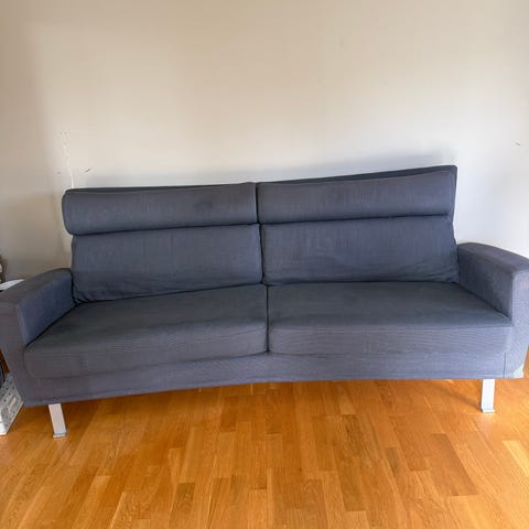 Skön Ire soffa med fotpall i modellen Vanity. Tyget är väldigt slitet och behöver bytas ut. Se bilder. Men kuddarna och stommarna är i fint skick. Avtagbart tyg. Se bilder för mått.