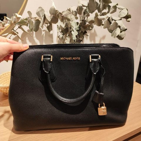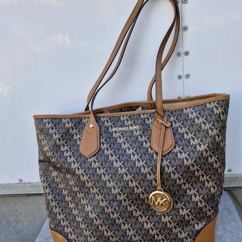 En tuff MK-ryggsäck med flätad struktur i silver och med guldmetall detaljer. Den har två utanpåliggande fack samt tre fack inuti. Den är hel, ren och fräsch både inuti och utvändigt. Det enda slitaget är enligt bild lite längst ner i bärremmarna. Mått: ca 36 cm hög och botten är 32 cm bred.