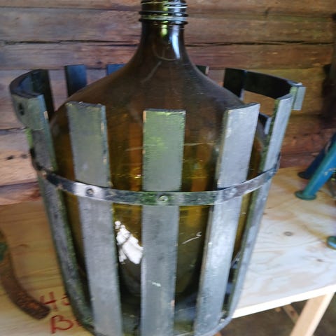 Glasflaska i brun färg med en volym på 30 liter. Flaskan är placerad i en träställning för stabilitet och skydd.