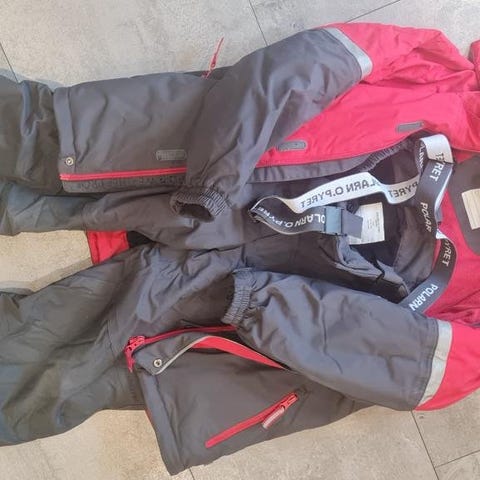 Vinterset med vinterjacka och fodrade byxor från Polarn O. Pyret i storlek 110. Avtagbar luva och snölås på jackan. De är båda något solblekta och det finns några mindre fläckar (se bild). De finns även några småhål längst ner på benslutet (se bild) men inget som stör funktionen.
