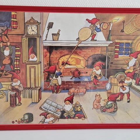 Sökord: julbonad tomtar retro vintage julverkstad julmotiv 50-tal 60-tal svensk tryckkonst väggbonad