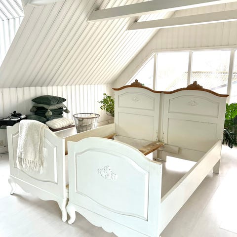 Vitmålad antik utdragssäng säljes. Standardmadrass storlek 105 x 200 cm har fungerat för oss. Kan passa t ex även med 90 x 200 cm. Sängen kan tas isär i tre delar för enklare transport.