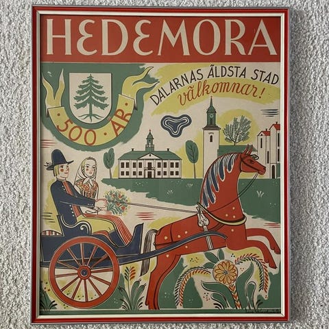 Bilden är en reklamaffisch som hyllar Hedemora, Dalarnas äldsta stad 1946.