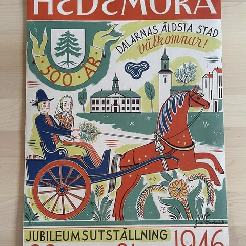 Bilden är en reklamaffisch som hyllar Hedemora, Dalarnas äldsta stad 1946.