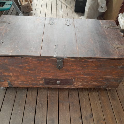 Kista på hjul, (bara hjulen är värda 600kr nypris). Kistan har som använts som soffbord och ibland sitt-bänk, bara släng på några sittdynor. Mycker användbar och bra förvaring! Stabil med stabila hjul.