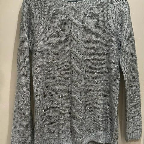 Annorlunda rolig vit tröja med paljetter i guld och svart. Storlek medium/large. Mått över bröstet från ärmhålans nedre kant är 50 cm (100 cm totalt). Längd från nacke ner till tröjans slut är 68 cm. Ärmlängd är 64 cm. Kan hämtas på Fridhemsgatan vid Fridhemsplan.