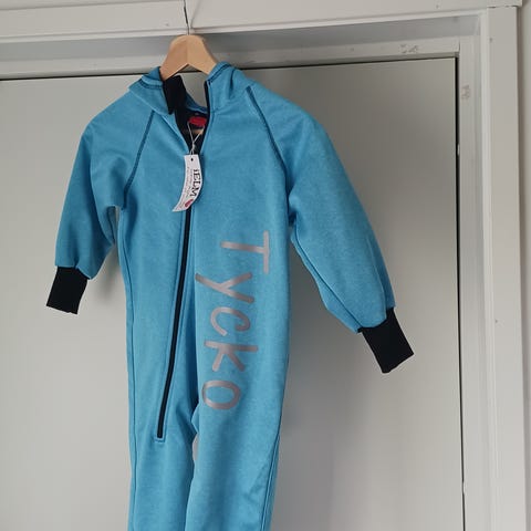 Söt overall med stjärnmönster och röd fleecefoder. Den har en dragkedja framtill och en huva.