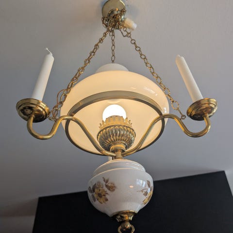 Lamphållare i koppar, mässing och porslin.
