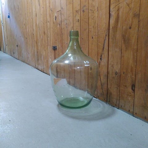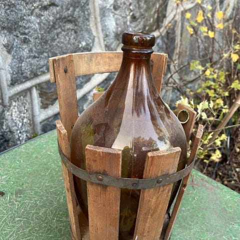 Gammal damejeanne i korg med halm. Troligen används i inredningen innan, ej rengjord. Korgen har en skadad pinne, se bild.