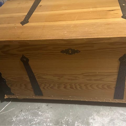 Fin brudkista som rymmer mycket. Låset är borttaget (tappat bort nyckel) så den går inte att låsa. Man behöver ta bort hela locket för att öppna. Har en del märken.