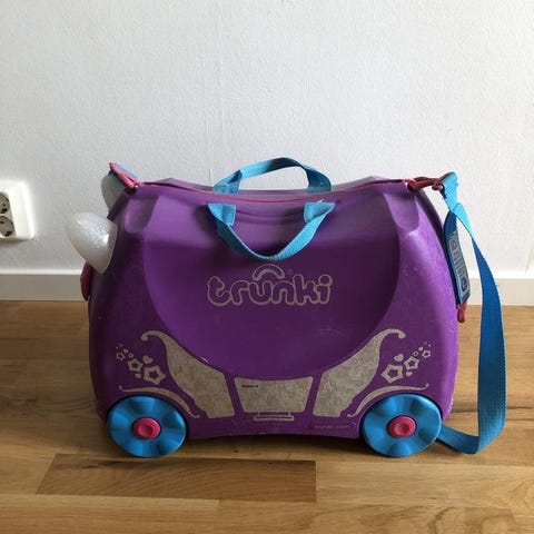 Mjuk sittdyna och rygg i gott skick. Fempunktsbälte (man kan ta bort axelremmarna om man vill). Kan växla till liggläge. Plats för saker under sitsen. Hjulen inte så slitna. Ena handtaget har dock gott sönder. Någon fläck finns.