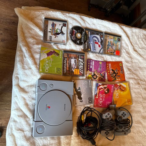 Originala Playstation med populära spel som Metal Gear Solid, Resident Evil I + II, Grand Theft Auto, Final Fantasy VII, VIII, IX. Kommer med kablar och 2 controllers. Använd men i fint skick. Köpt i England.