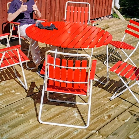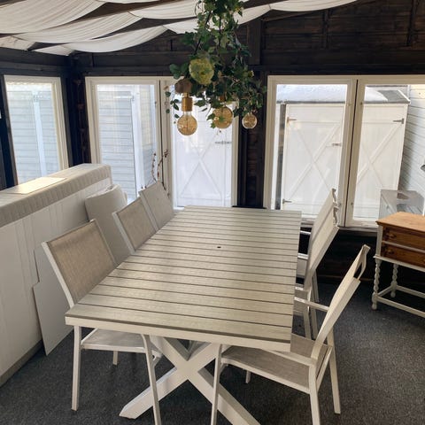 Exemplet på bilden är bord och stolar 2,5m långa och har plats för 8-10 personer.