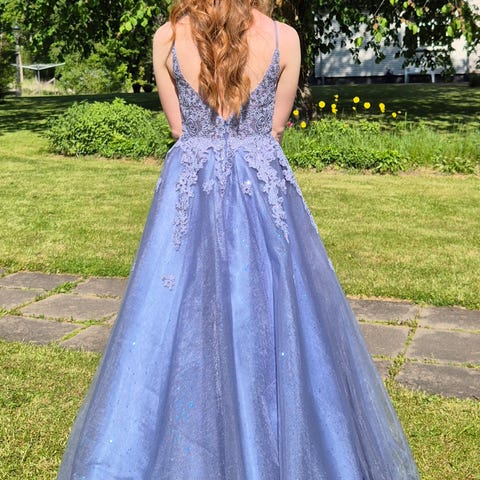 En fantastiskt fin balklänning i ett glittrande blått tyg. Storleken är lite justerbar men passar en person som har xs-s. På bilderna bärs den av tjej som är 167 cm lång men utan några klackar.