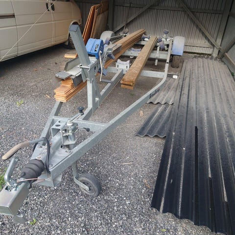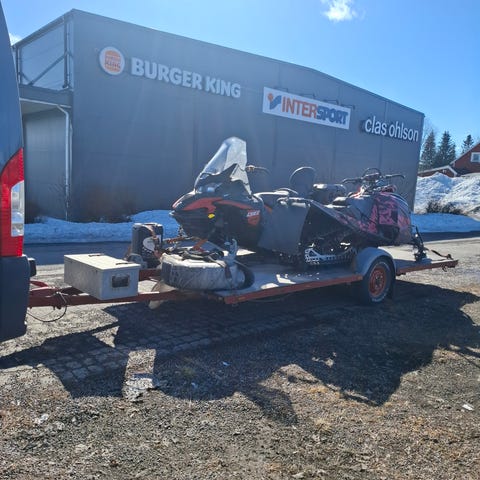 Långt släp, lastyta på hela 6 m. Här får både skoter och skoterpulkan plats, eller Atv med släp (tidigare ägare var en brandstation som hade den till det, så lite använd). Totalvikt 1 300 kg, maxlast 725 kg. Mönsterdjup sommardäck ca 7 mm, dubbade vinterdäck ca 10 mm. Besiktigad tom 260630. Pris 32 000 kr, ej momsad. 070-252 56 56