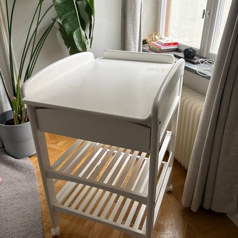 Alfred väggskötbord by BabyDan är väldigt platsbesparande i mindre rum. Skötplatsen kan nämligen stoppas undan när den inte används. När det är låst är skötbordet endast 17 cm djupt. Hyllorna ger massor av förvaringsplats till blöjor, kläder, krämer och våtservetter. Det extra långa skötområdet (ca 55x80 cm) ger gott om plats för trevlig sköttid. Skötbordet är tillverkat i lackerad metall och är därför mycket enkelt att rengöra och passar särskilt bra för användning i badrummet. På Skötbordet finns det mindre spår av användning i form av lite ytlig rost. Det går enkelt att åtgärda med t.ex. sprayfärg om man vill fräscha upp utseendet, men inget som påverkar funktionen på skötbordet.